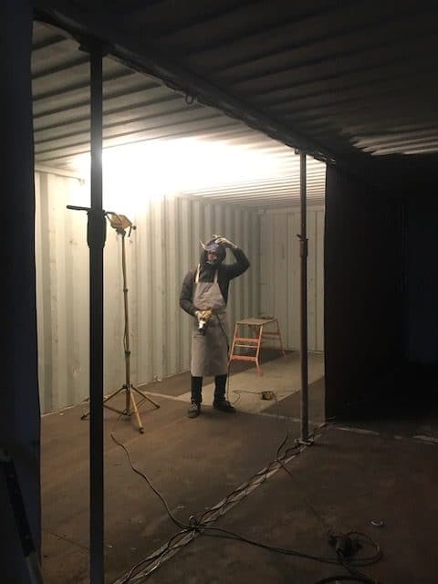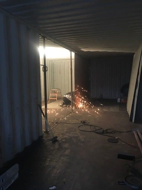 Ca nous fait penser, que l’on a oublié de mentionner dans l’article précédent: lorsqu’on a posé les conteneurs, on a du couper le conteneur a chaque arrivée d’eau. Les tuyaux dépassaient de la dalle ( ils étaient coules dedans ), il fallait qu’ils dépassent dans le conteneur, donc a chaque fois avant de le poser, Killian coupait des carrés pour rentrer les tuyaux.